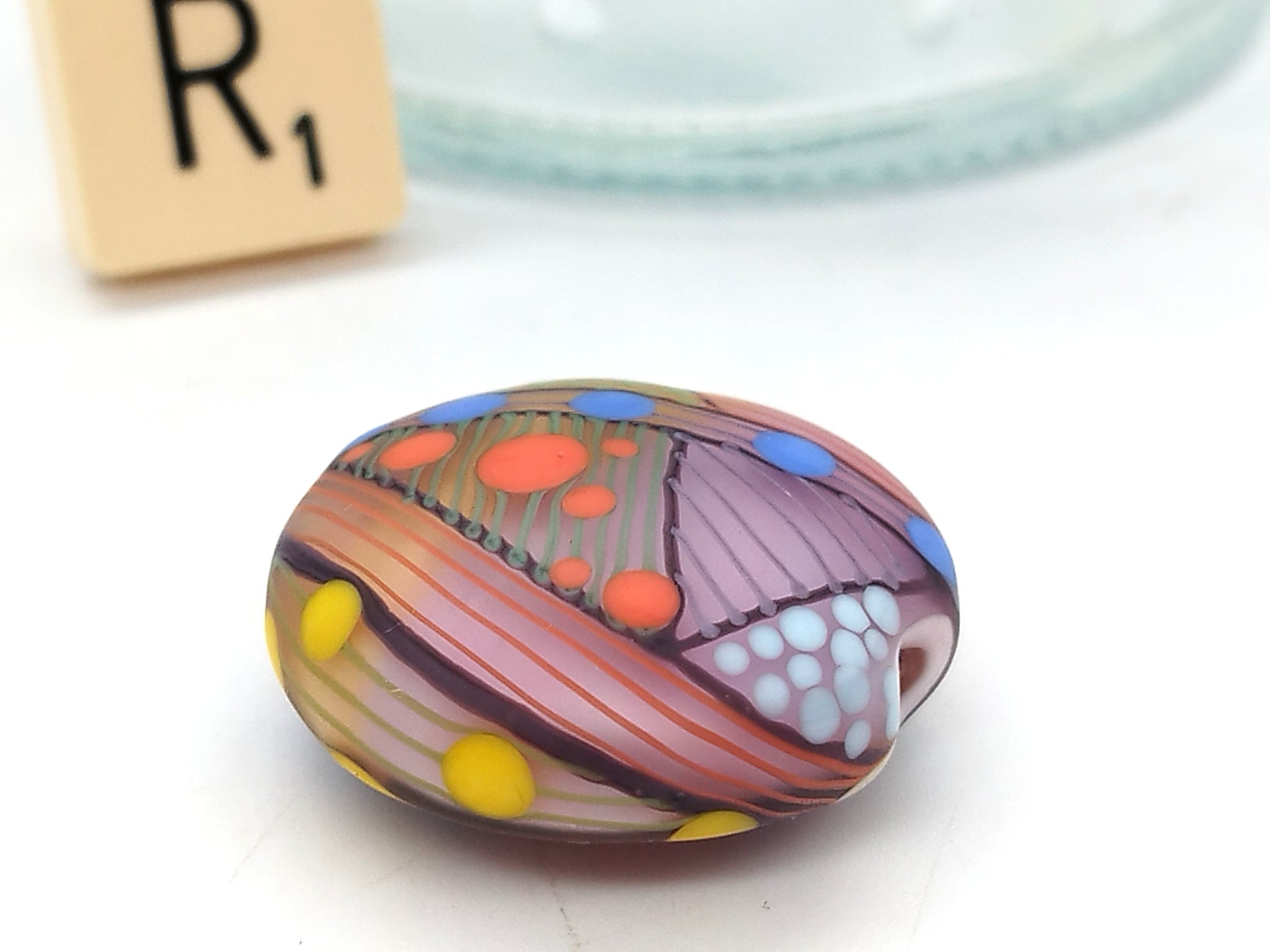 This extra large sized lentil focal bead measures 31.5mm across by 15mm deep at deepest point. It has an encased pink and lilac core base with the patchwork pattern in purple, light blue, lilac, green, cornflower, jade, lemon, and red. It has been etched and was wound on a 2mm mandrel. Please note: Etched beads have a light coating of handmade organic beeswax and olive oil polish.