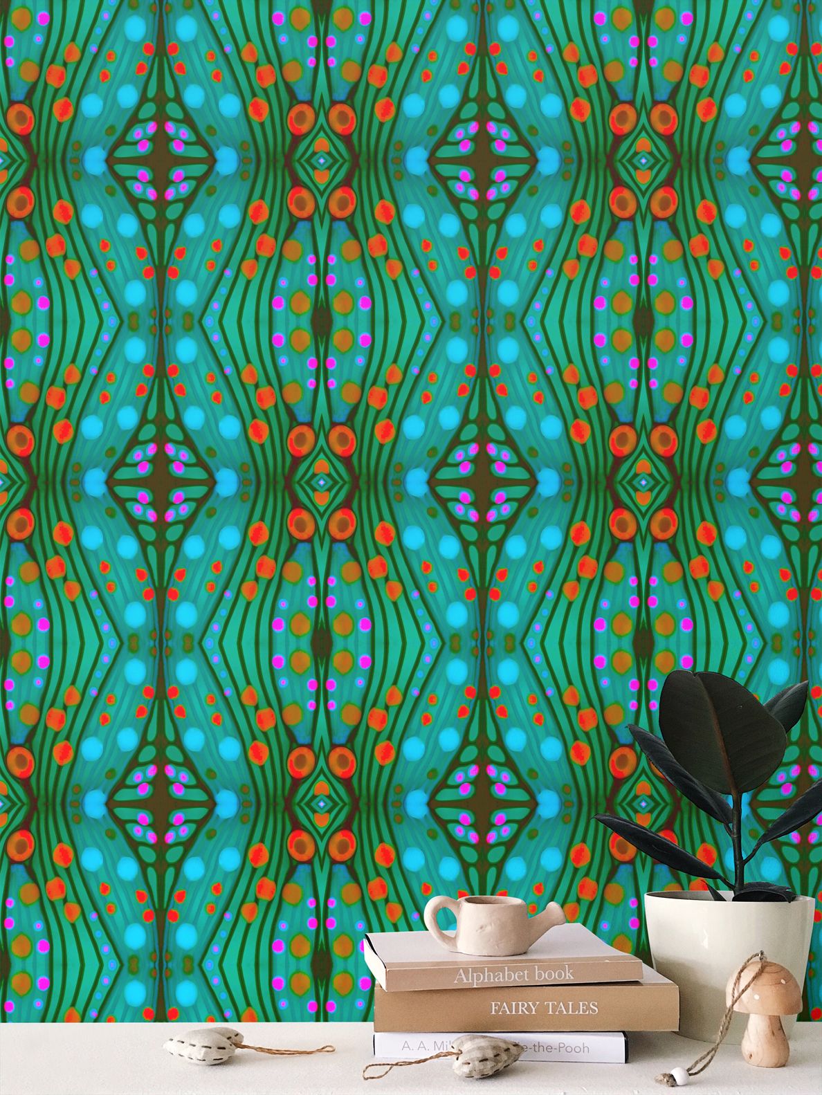 Moogin Nouveau-esque Wallpaper in Turquoise and Coral by Mindy Macgregor