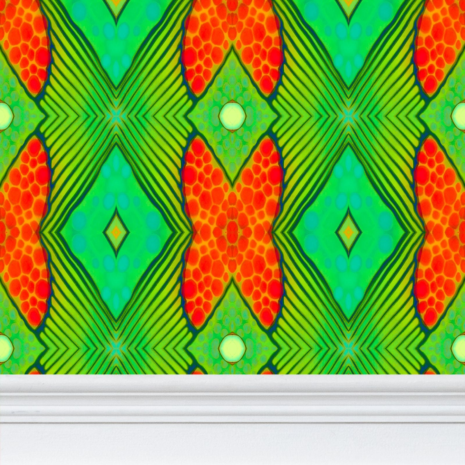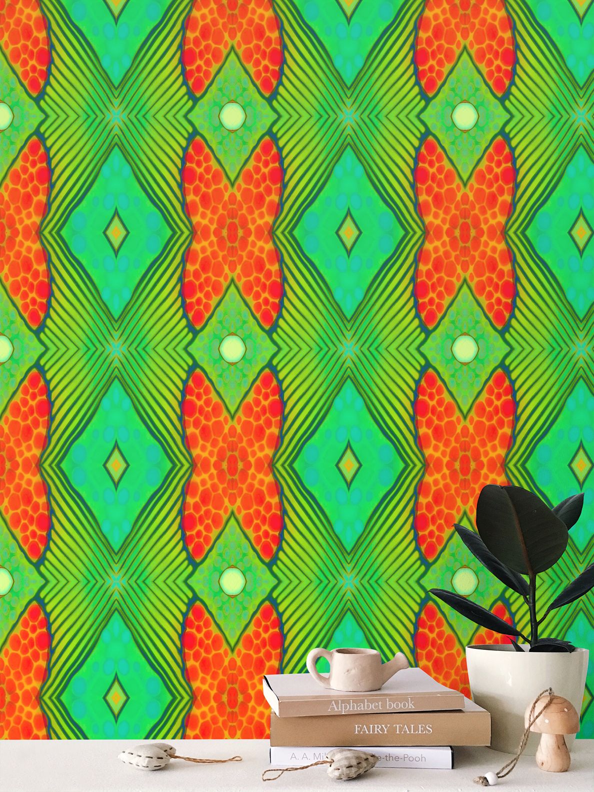 Moogin Soft Geometry Wallpaper in Lime and Orange by Mindy Macgregor